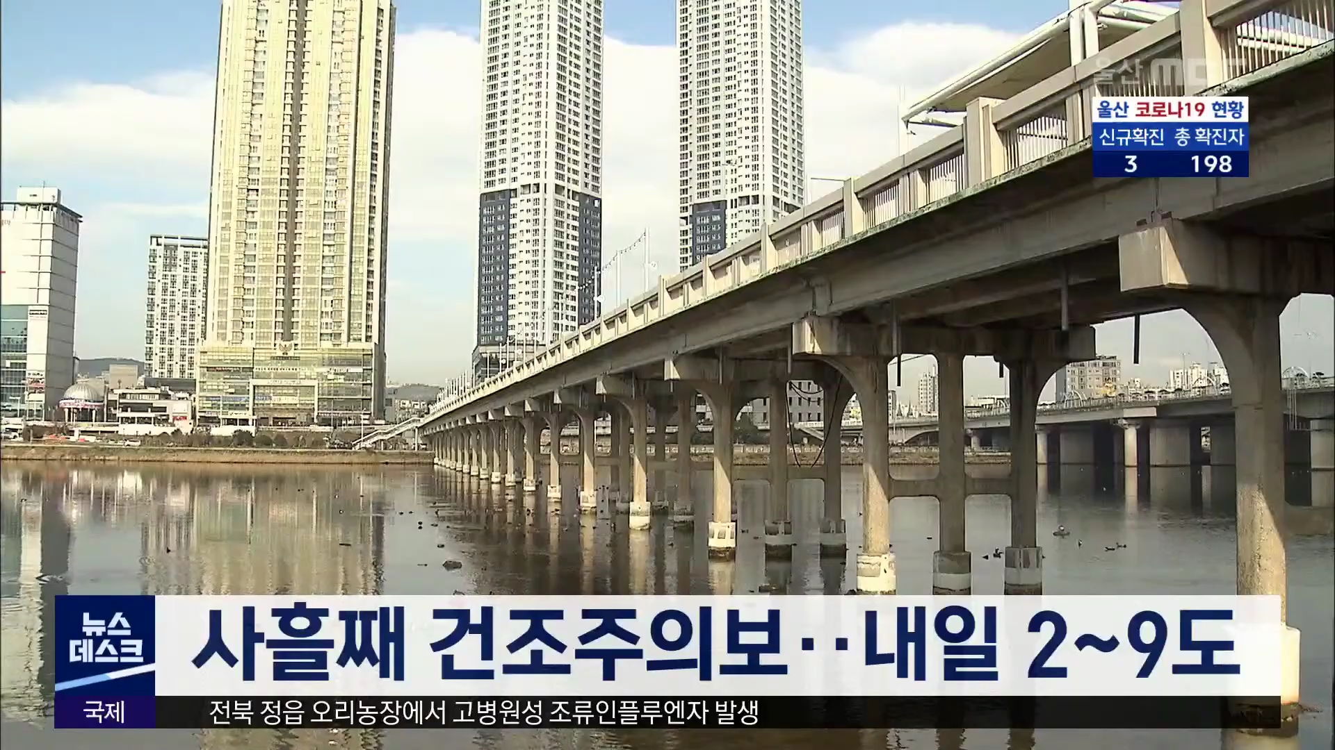 휴일인 오늘 울산지방은 고기압의 영향으로 대체로 맑은 가운데 낮 최고 기온은 8.4도에 머물러 쌀쌀했습니다. 내일도 맑고 건조한 날씨가 이어지겠고 아침 최저 2도, 낮 최고 9도의 기온 분포를 보이겠습니다. 울산기상대는 사흘째 건조주의보가 내려진 만큼 각종 화재사고 예방에 각별한 주의를 당부했습니다./