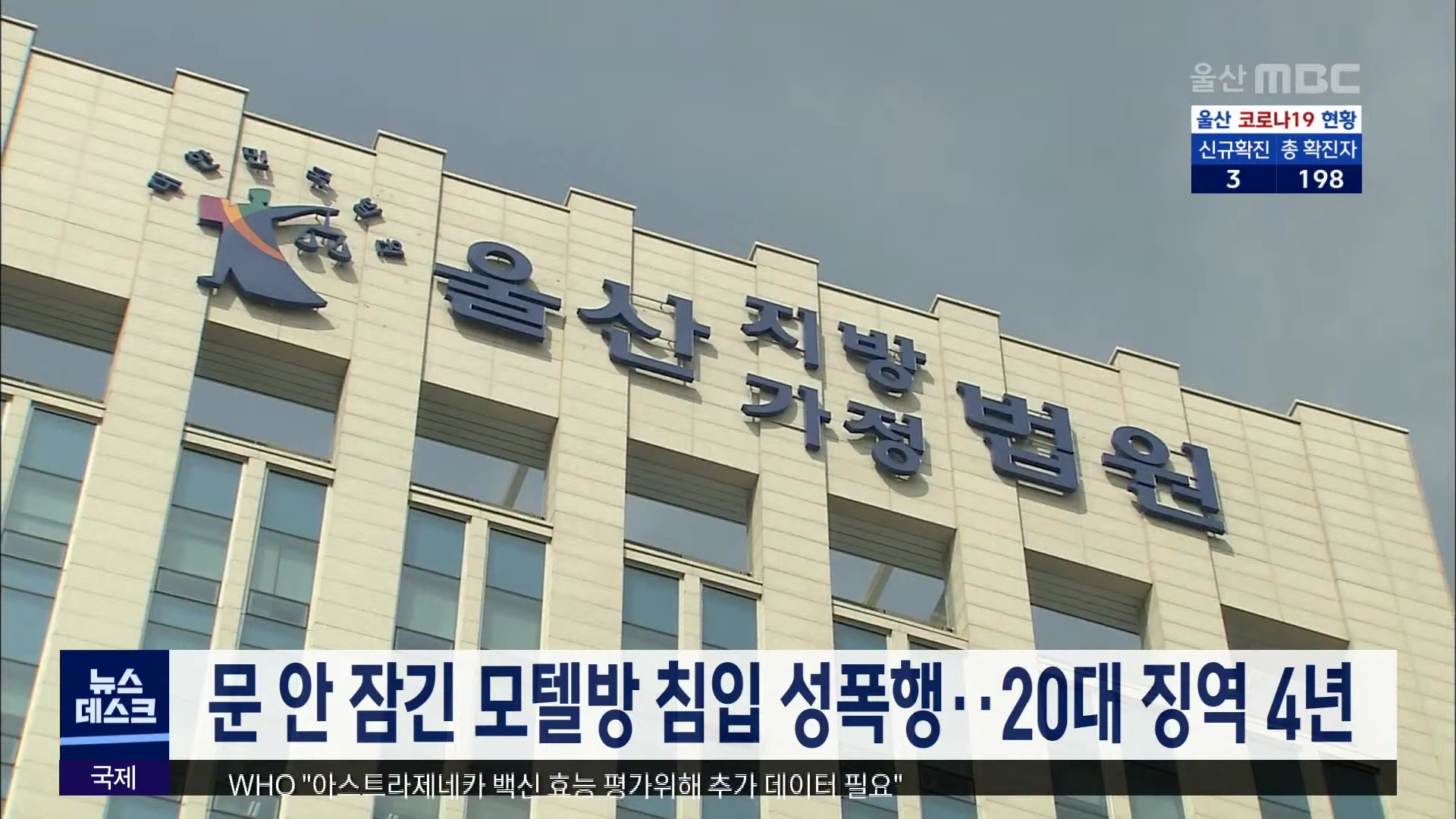 잠겨 있지 않은 모텔 방을 찾아 들어가 술에 취한 여성을 성폭행한 20대에게 실형이 선고됐습니다. 울산지방법원은 성폭력범죄의 처벌 등에 관한 특례법 위반 혐의로 재판에 넘겨진 A씨에게 징역 4년을 선고하고 성폭력 치료프로그램 80시간 이수를 명령했습니다. A씨는 올해 7월 울산의 한 모텔에 들어가 술에 취해 자고 ...