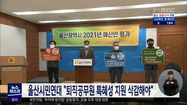 울산시민연대는 오늘(11/25) 시의회 프레스센터에서 내년도 울산시 예산안 평가 기자회견을 열고 "코로나19 피해자 구제를 위한 새로운 시 정책을 찾아볼 수 없다"고 비판했습니다. 시민연대는 특히 "퇴직공무원 단체인 행정동우회에 특혜성 지원예산이 편성됐고, 퇴직공무원 포상액도 1인당 154만원으로 전국 평균의 두 ...