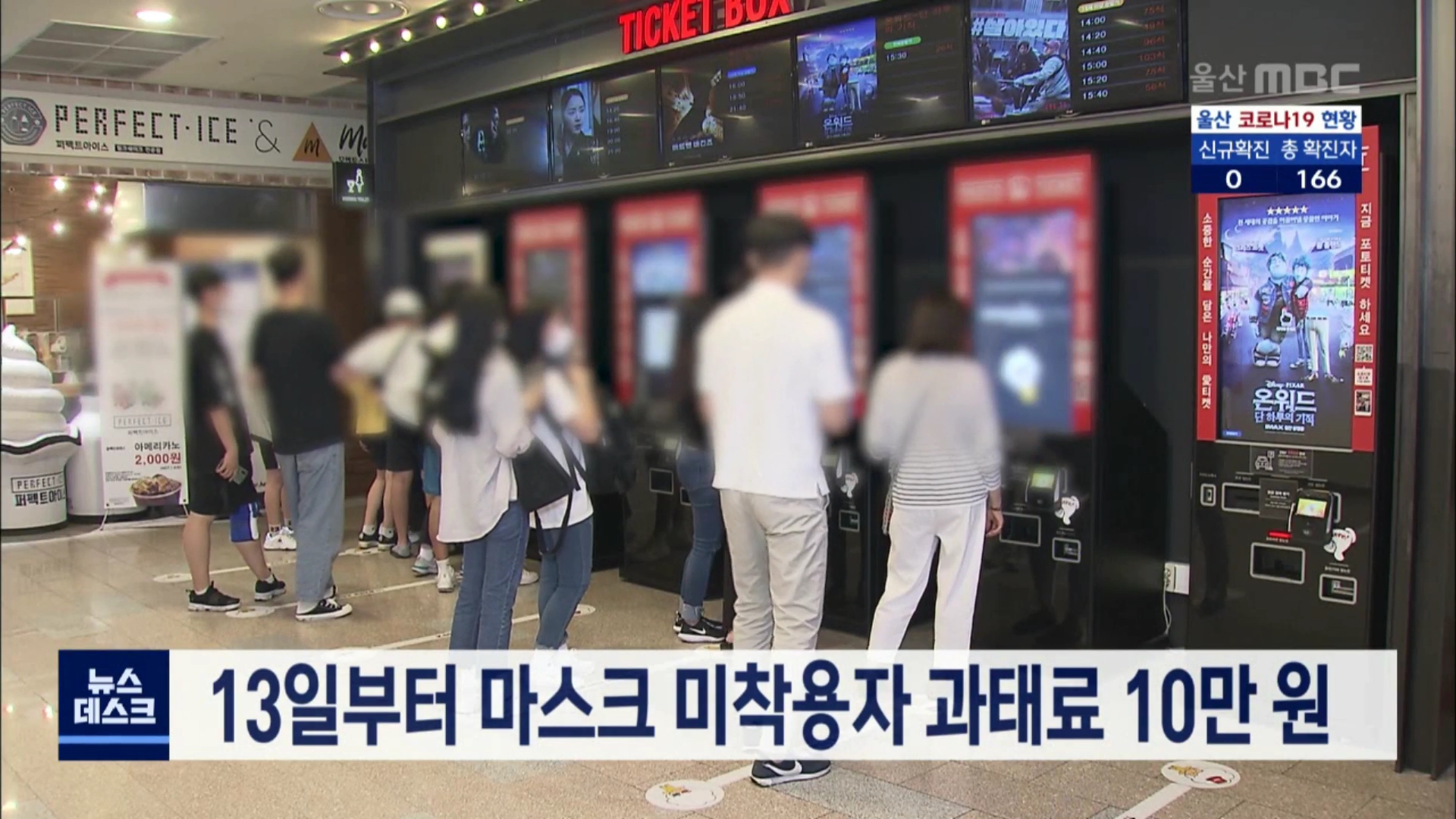 이번주 수요일인 13일부터 마스크 착용 의무화 위반자에게 과태료가 부과됩니다. 울산시는 한 달간 계도기간이 끝남에 따라 영화관과 장례식장, 대중교통, 유흥주점 등 서른 종류 시설 이용자 중 위반자에 대해 과태료를 부과할 계획입니다. 시는 마스크 착용을 지도해도 지키지 않으면 당사자에게 과태료 10만 원을 부과하...