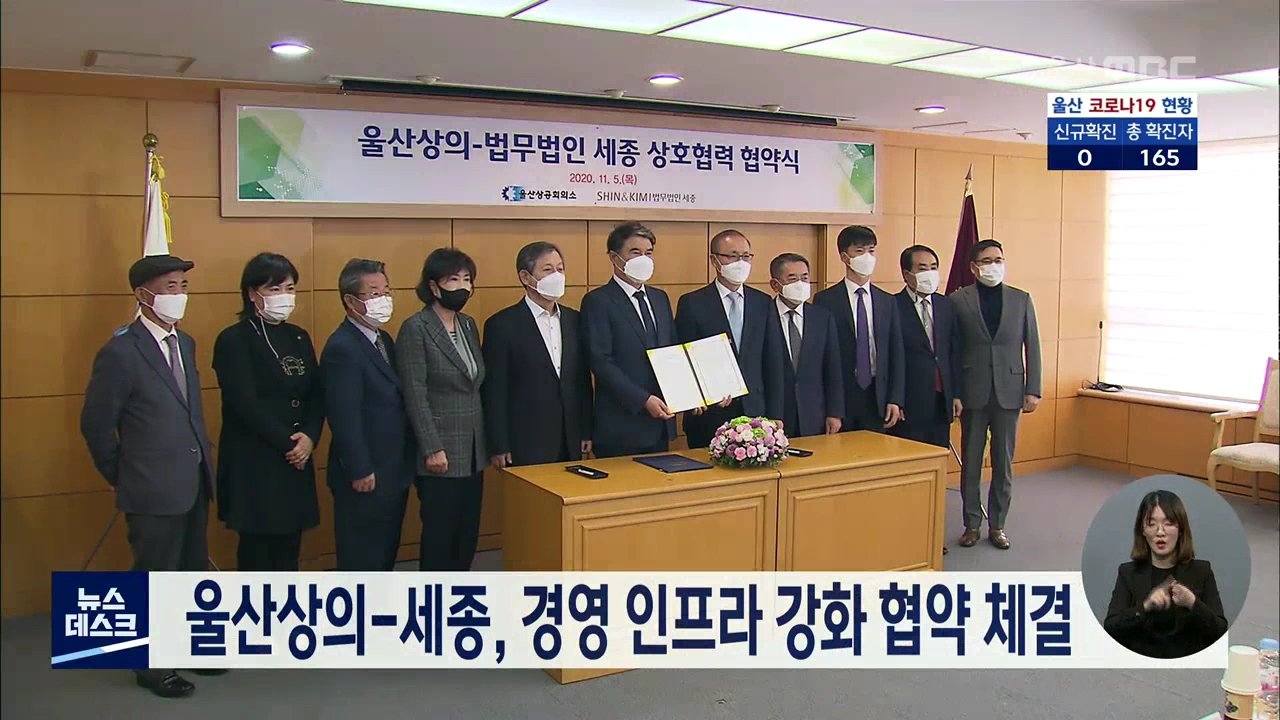 울산상공회의소는 오늘(11/5) 코로나19 사태로 크게 악화된 지역 기업들의 경영 인프라 강화를 위해 법무법인 세종과 상호 협약을 체결했습니다. 이번 협약으로 세종측은 울산상의 회원사에 대한 각종 법률자문과 교육 서비스를 제공하고, 상호 관심분야에 대한 정보교환과 인적교류 등의 협력을 확대해 나가기로 했습니다....