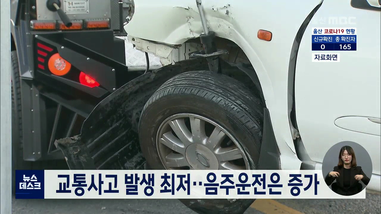 울산지역 교통사고 발생과 사망자 수가 역대 최저를 기록했지만 음주운전 교통사고는 늘어난 것으로 나타났습니다. 울산지방경찰청이 조사한 결과, 지난달까지 교통사고 발생은 3천1백여 건으로 전년 동월 대비 11% 줄었지만, 음주운전 교통사고 발생은 349건으로 지난해 같은 기간보다 16.3% 증가했습니다. //