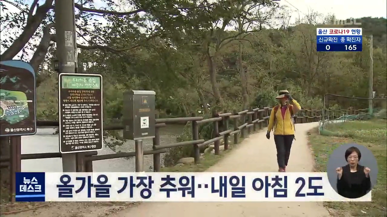 오늘(11/3) 울산지방은 대체로 맑은 가운데 기온이 아침 최저 4.3도로 올 가을 들어 가장 추웠습니다. 내일은(11/4) 아침 기온이 2도까지 떨어져 오늘보다 더 춥겠고, 낮 기온은 18도로 일교차가 크겠습니다. 울산기상대는 이틀째 건조주의보가 내려져 화재 예방에 유의할 것을 당부했습니다.