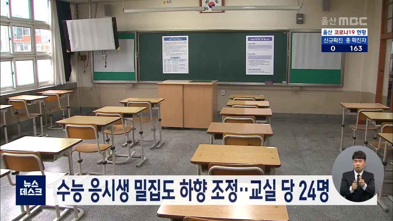 울산교육청이 코로나19 확산 우려 속에 치르는 대학수학능력시험에 대비해 수험생 밀집도를 낮추기로 했습니다. 시교육청은 지난해 한 교실에 수험생 28명을 배정하고 442개 시험실을 마련했지만, 올해는 523개 시험실을 확보해 24명의 수험생이 한 교실에서 시험을 치도록 할 계획입니다. 또 일반시험장과 별도시험장, 병...