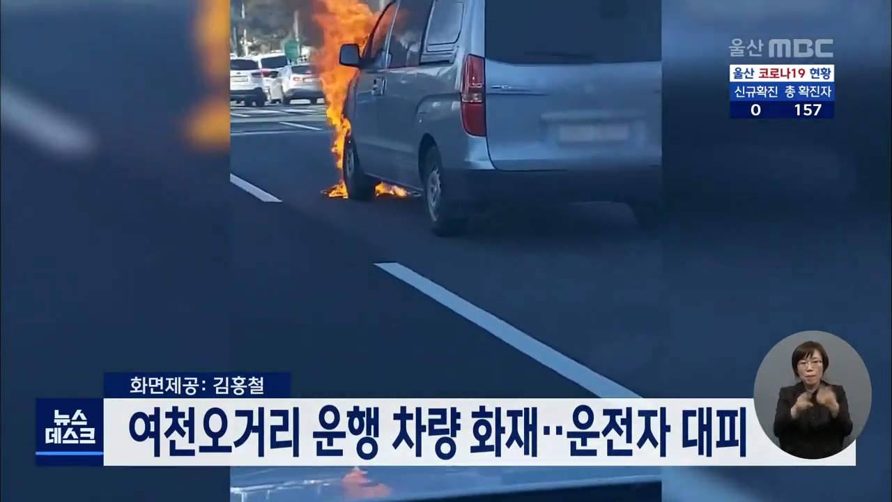 오늘(10/23) 오전 7시 55분쯤 남구 여천오거리를 지나던 차량에서 불이 났습니다. 이 불로 엔진룸 등을 태워 소방서 추산 450만 원의 재산 피해를 내고 10분 만에 꺼졌으며, 운전자는 재빨리 피해 다치지 않았습니다. 소방당국은 차량 앞부분에서 불이 시작된 것으로 보고 운전자를 상대로 화재 경위를 조사하고 있습니다. ...