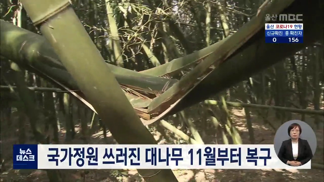 국가정원에 쓰러진 대나무가 방치되고 있다는 보도와 관련해 울산시는 다음달부터 본격적인 복구작업에 나설 예정이라고 밝혔습니다. 울산시는 대나무를 방치하고 있는 것이 아니라 죽순이 나오는 시기와 생육 환경을 감안해 11월부터 간벌 작업과 복구 작업을 하는 것이 가장 적합하다고 판단해 복구 시기를 기다리고 있다...