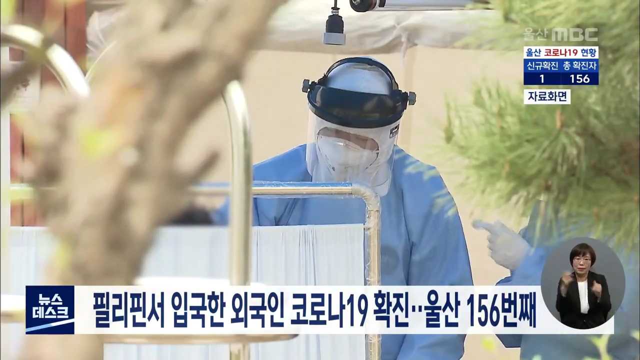 필리핀에서 입국한 외국인이 코로나19 확진 판정을 받았습니다. 외국인 A씨는 어제(10/12) 필리핀에서 입국해 동구보건소 선별진료소에서 코로나19 검사를 받았습니다. 울산시는 자가격리 장소를 방역하고, 추가 접촉자 등을 역학조사하고 있습니다. 울산에서 코로나 확진자는 모두 156명입니다.