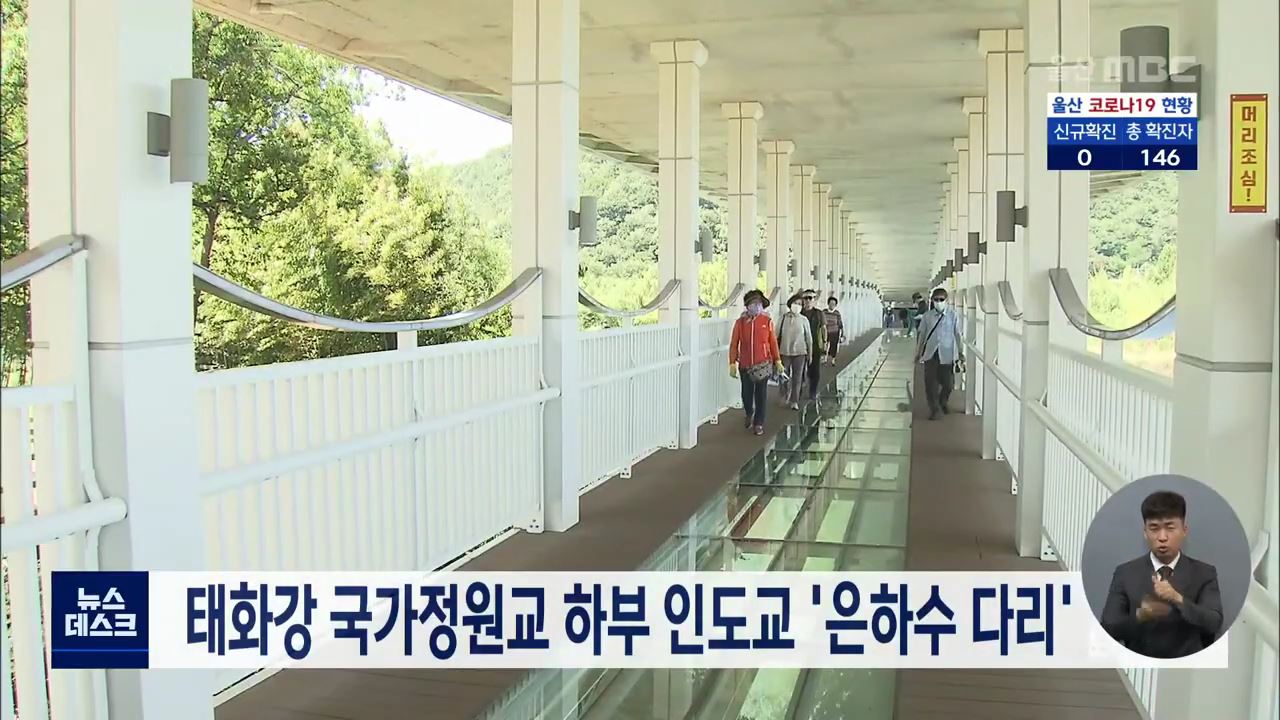 태화강 국가정원교 하부에 설치된 인도교 이름이 '은하수 다리'로 결정됐습니다. 울산시가 실시한 선호도 조사에서 국가정원 방문객 5천212명 가운데 60% 정도가 '은하수 다리'를 선호했습니다. 은하수 다리와 최종 경합을 벌인 후보 명칭은 철새 다리와 오작교, 오죽교, 오산교 등입니다.