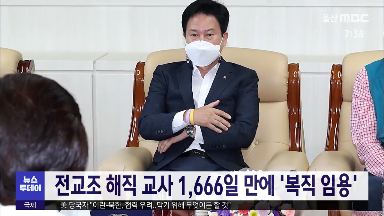 울산교육청은 오늘(9/21) 대법원 판결로 법적지위를 회복한 전국교직원노동조합 울산지부장 권정오 교사를 복직 임용했습니다. 해고된지 1천666일 만에 복직한 권 지부장은 전교조 임기가 끝나는 연말까지 휴직한 뒤 내년 1월부터 북구 호계중학교에서 근무하게 됩니다. 시교육청은 임금 보전과 호봉 산정 등의 후속 조치는...