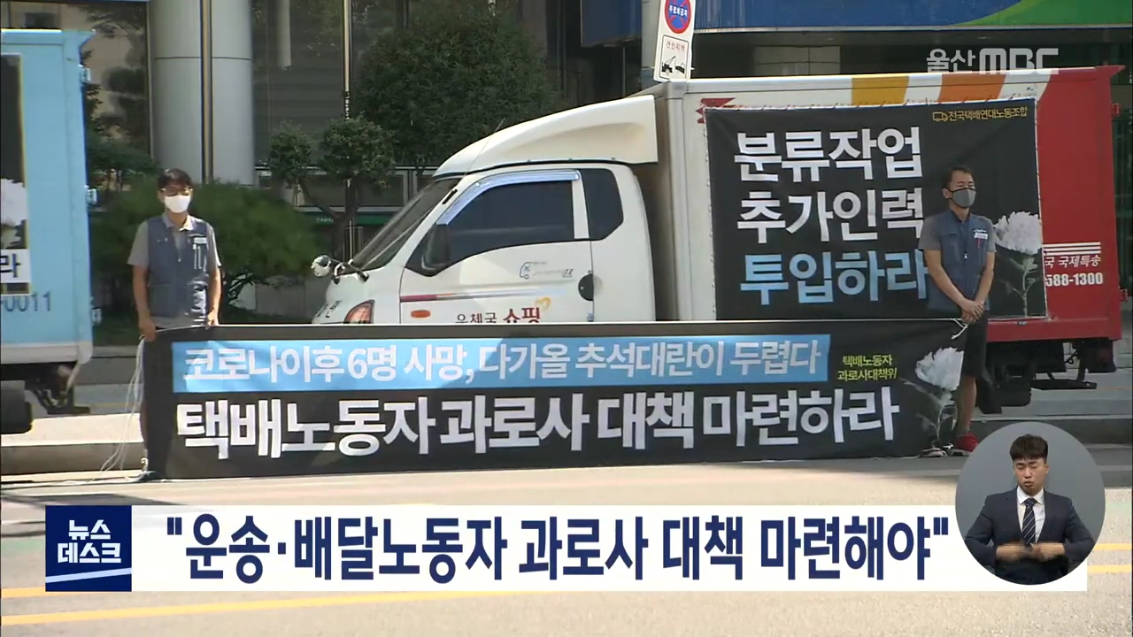 민주노총 울산본부는 최근 코로나19와 추석 명절의 영향으로 운송과 배달업 노동자의 과로 문제가 심각하다며 대책 마련을 요구했습니다. 이들은 코로나19 방역조치로 각종 배달 물량이 급증하면서 올해만 택배노동자 7명이 과로사했는데도 택배회사들이 별다른 대책을 내놓지 않은 채 추석 명절 등을 이유로 노동량을 더 ...