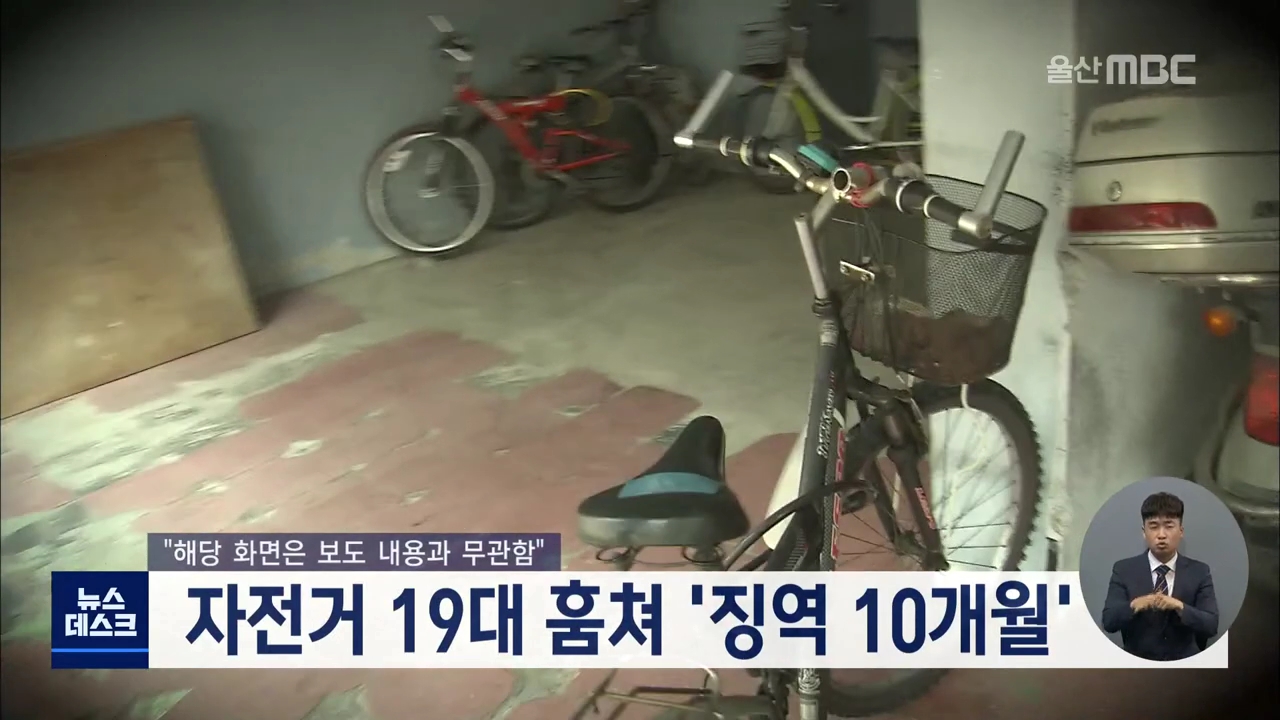 울산지법 형사8단독 정현수 판사는 상습적으로 자전거를 훔친 혐의로 기소된 26살 A씨에게 징역 10개월을 선고했습니다. A씨는 지난해 11월부터 수개월 동안 자물쇠 절단기를 이용해 19차례에 걸쳐 1천800만 원 상당의 자전거를 훔친 혐의로 재판에 넘겨졌습니다.//