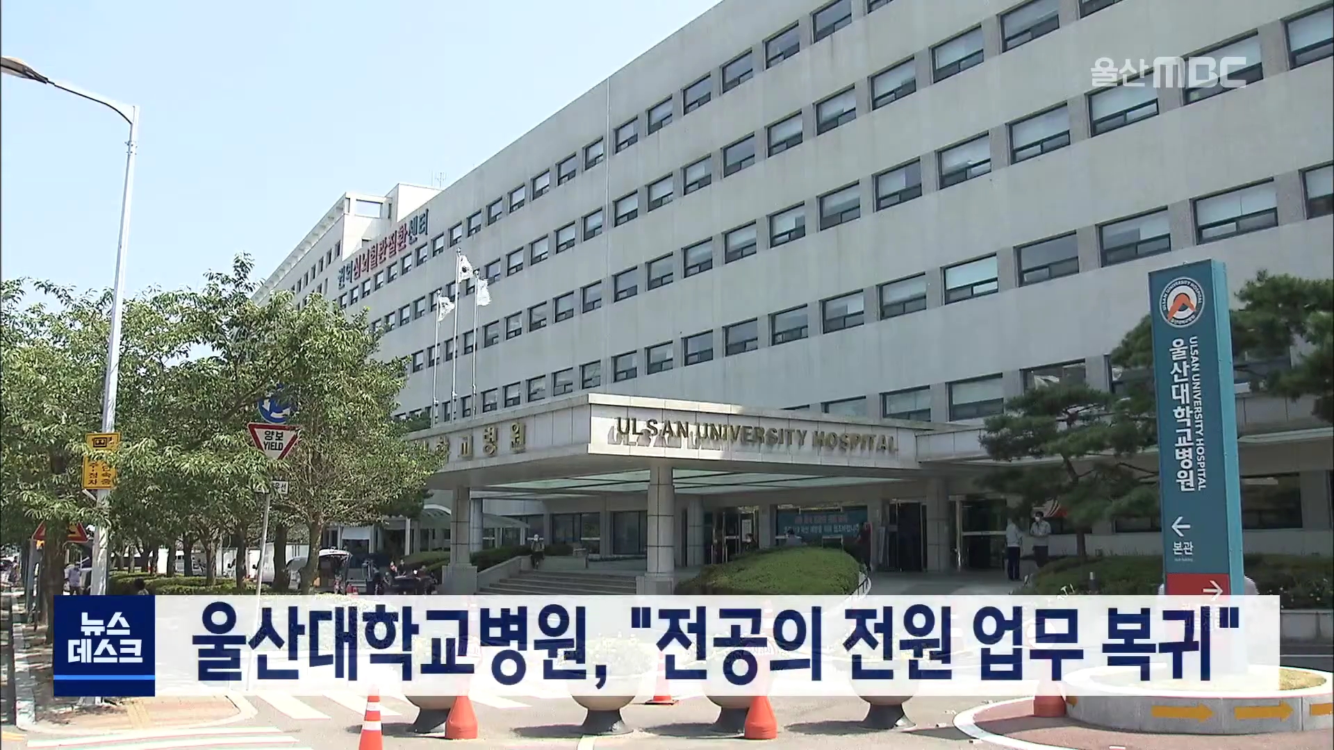 울산대학교병원은 내일(9/7) 오전 7시부로파업에 참여한 전공의 121명 전원이업무에 복귀한다고 밝혔습니다.지난달 21일 의과대학 정원 확대 등정부의 의료정책에 반대하는전공의들이 총 파업에 돌입하면서울산대병원 전공의121명이 업무를 중단했습니다. //