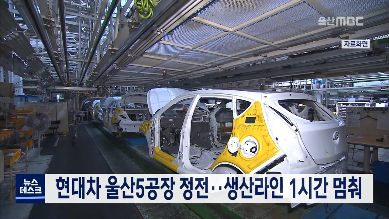 오늘(9/5) 오전 8시 30분쯤 울산 북구 현대자동차 울산5공장에서 정전이 발생해 1시간 동안 생산라인이 가동되지 못했습니다. 회사 측은 태풍 하이선에 대비하기 위해 크레인을 동원해 컨테이너를 옮기는 과정에서 인근 전신주에 문제가 발생해 정전이 일어난 것으로 보인다고 밝혔습니다. //