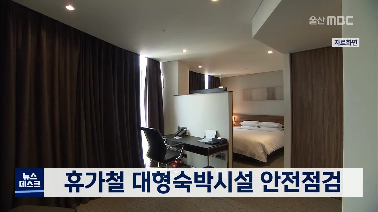 울산시는 오는 24일까지 휴가철 시민들과 관광객들이 이용하는 대형 숙박시설에 대해 안전점검을 실시합니다. 울산시와 5개 구군은 합동 점검반을 편성해 관광호텔 등 대형 숙박시설 7곳을 대상으로 지반 침하와 균열, 철근 부식 등을 점검합니다. 울산시는 점검 결과 긴급 보수가 필요한 사항은 응급 보수를 실시하도록 하...