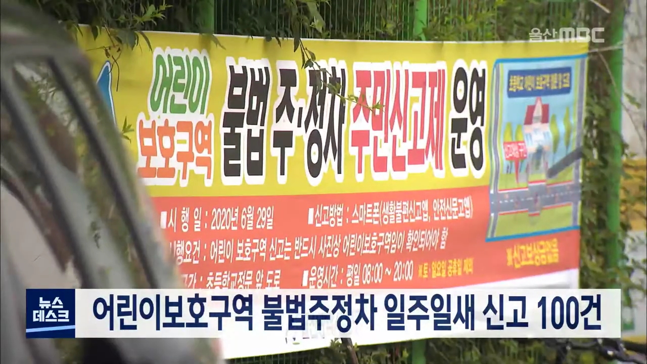 어린이보호구역 내 불법 주정차 주민신고제 시행 후 일주일 동안 울산에서 100건의 신고가 들어온 것으로 나타났습니다. 울산 5개 기초자치단체에 따르면 신고제가 시작된 지난 3일 이후 주말을 뺀 일주일 동안 안전신문고 앱으로 주민 신고가 100건 접수됐습니다. 지역별로는 중구가 50건으로 가장 많았으며 남구 44건, 북...