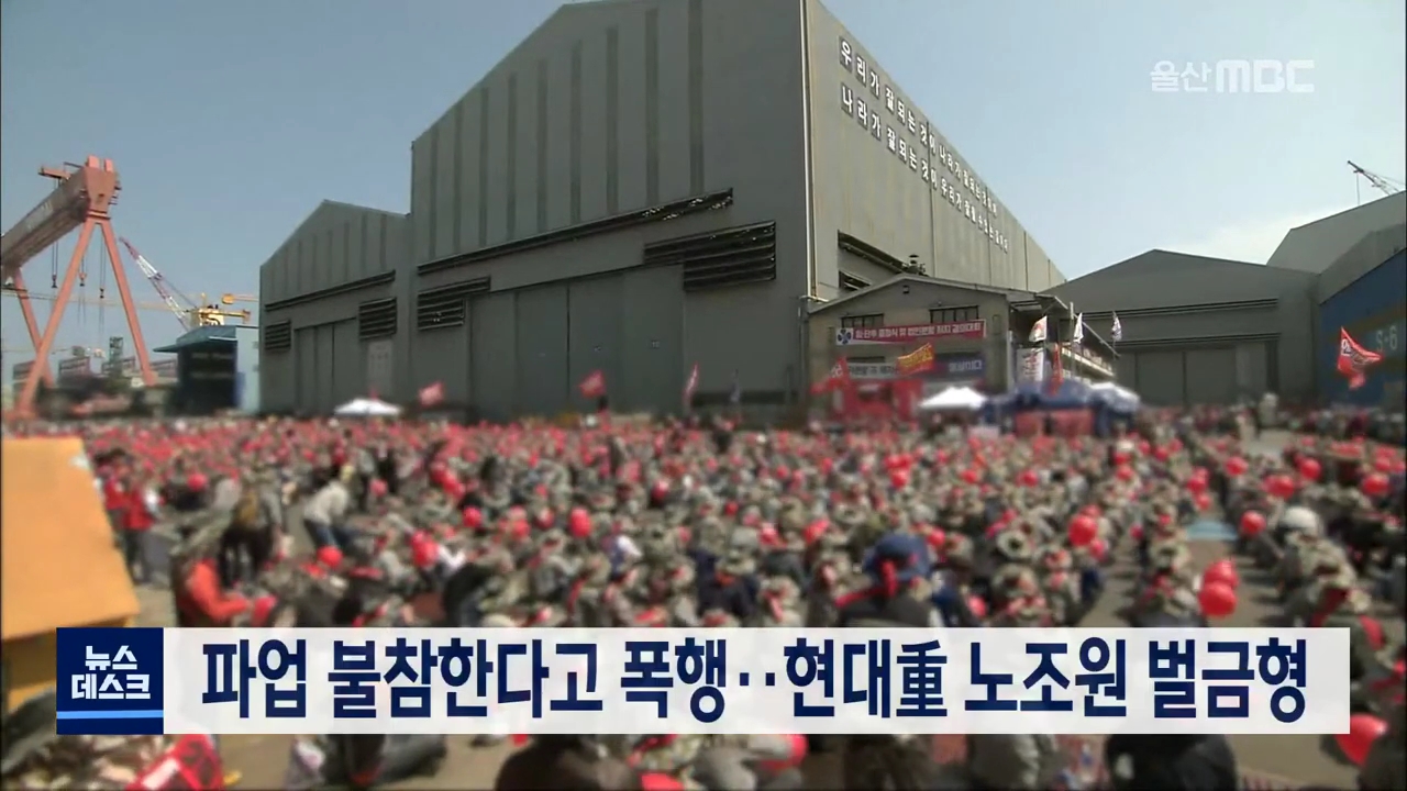 지난해 현대중공업 노조의 법인분할 반대 파업 과정에서 파업에 참여하지 않은 직원을 폭행한 조합원들에게 유죄가 선고됐습니다. 울산지방법원 문기선 판사는 공동상해 혐의로 기소된 현대중공업 노조원 김모 씨와 안모 씨에게 각각 벌금 200만 원을 선고했습니다. 이들은 파업을 벌이던 지난해 6월 파업에 참여하지 않은 ...