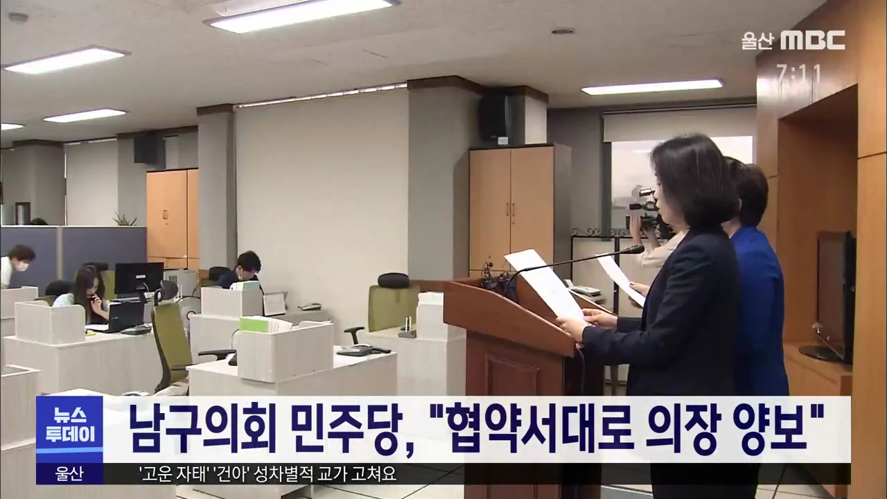 남구의회 더불어민주당 의원들이 원 구성 관련 주민들께 심려 끼친 점을 사죄하고 협약서대로 후반기 의장 자리를 미래통합당에 양보한다고 밝혔습니다. 이에 대해 통합당 측은 민주당의 결정을 환영한다며 전반기에 했던 것처럼 두 정당이 합의해 원 구성을 하도록 하겠다고 밝혔습니다. 남구의회 민주당과 통합당 의원들...