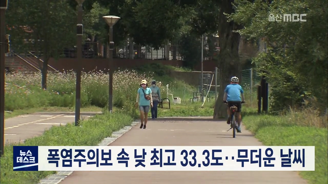 주말인 오늘(8/1) 울산지방은 폭염주의보가 내려진 가운데 낮 최고 33.3도를 보이며 평년 기온을 웃도는 무더운 날씨를 보였습니다. 내일은 구름 많은 날씨 속에 아침 최저 24도로 시작해 낮에는 32도까지 오르겠습니다. 울산기상대는 당분간 높은 기온과 함께 습도도 높아, 체감온도는 더 높아지겠다며 건강관리에 주의를 ...