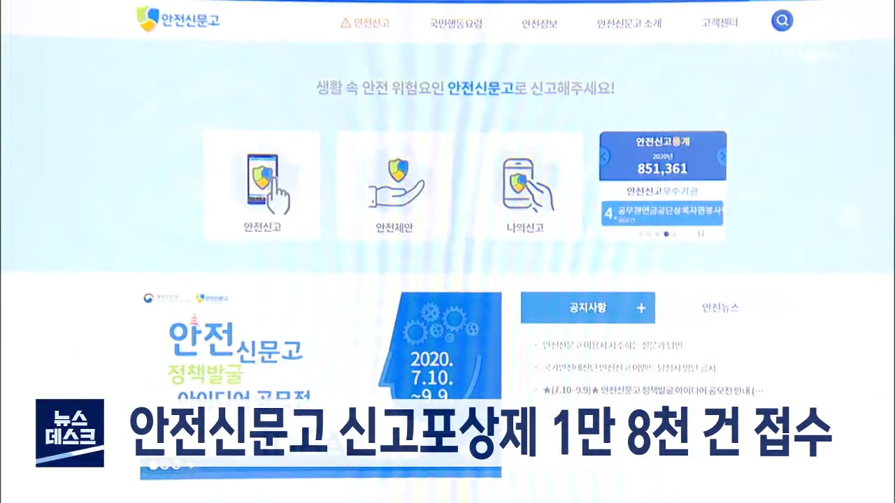 울산시가 올해부터 안전신문고 신고포상제를 운영한 결과 올 상반기에만 1만8천여 건의 신고가 접수됐습니다. 이 제도는 안전신문고 홈페이지나 스마트폰 안전신문고 앱을 이용해 일상생활 속에서 발견한 안전 위험 요인을 신고하거나 안전 관련 정책을 제안하는 것입니다. 시는 접수된 신고의 90% 정도를 채택해 개선했으...
