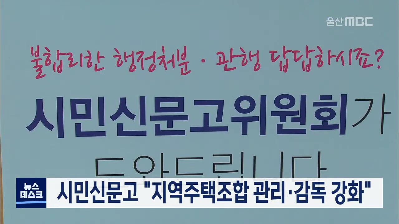 울산시 시민신문고위원회가 서민 주거 안정을 위해 지역주택조합의 투명한 운영과 관리 감독을 권고했습니다. 위원회는 울산시에 지역주택조합의 추진 사항 등을 보여 주는 홈페이지 운영을 주문했습니다. 또한 울산도시공사가 지역주택조합의 업무대행 역할을 적극적으로 할 것을 요구했습니다. //