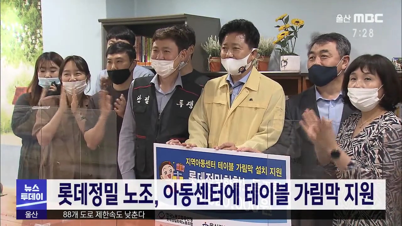 롯데정밀화학노동조합 사랑의 봉사단이 중구 지역아동센터에 써달라며 400만 원 상당의 테이블 가림막을 기부했습니다. 해당 가림막은 투명 아크릴로 시야를 방해하지 않고 비말이 튀는 것을 막아 코로나19 감염을 예방하기 위한 것입니다. 중구청은 관내 지역아동센터 9곳 가운데 아직 가림막이 설치되지 않은 7곳에 전달...