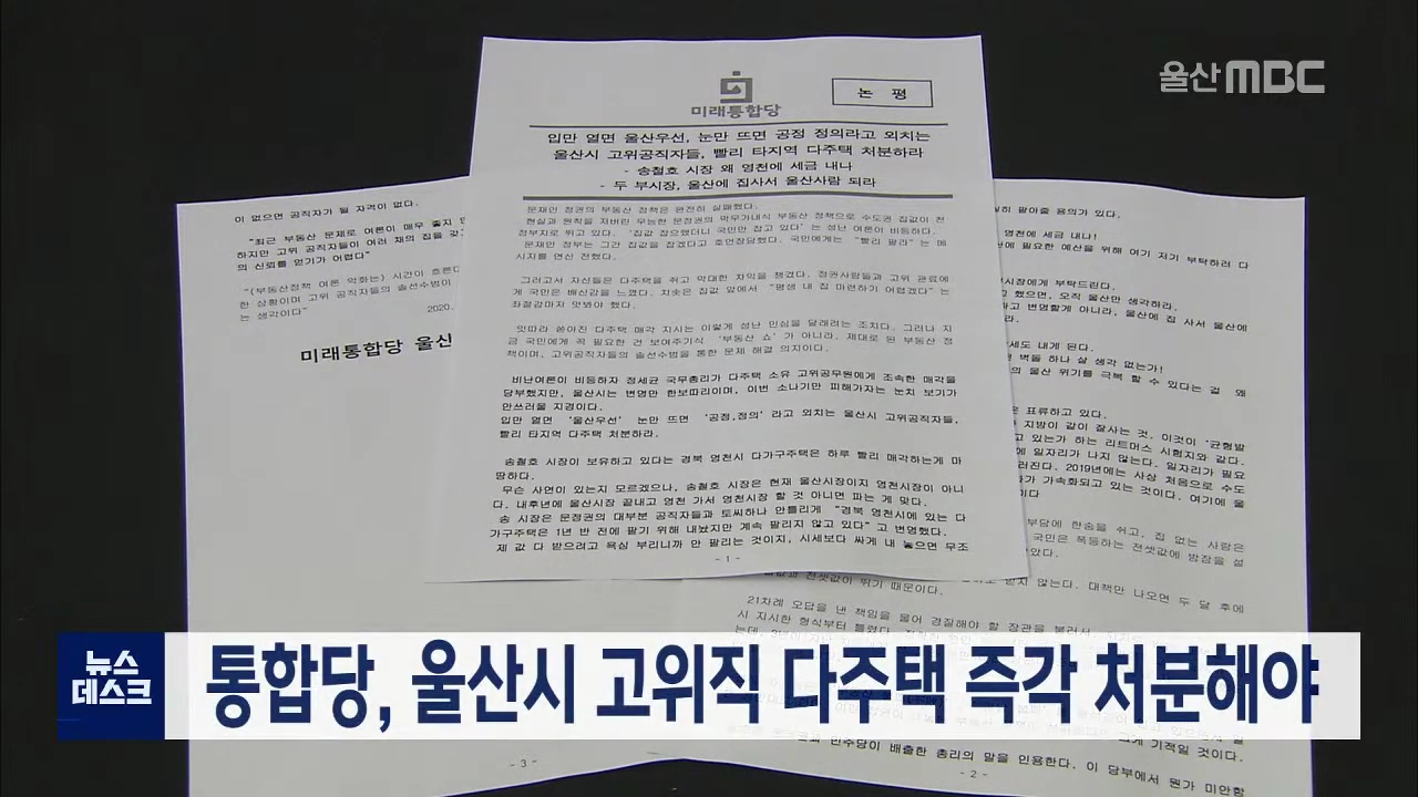미래통합당 울산시당이 송철호 울산시장 등 고위직 공무원의 다주택 보유를 비판하는 성명을 냈습니다. 통합당은 송철호 시장은 경북 영천에 왜 세금을 내놔며 영천에 있는 다가구 주택을 즉각 처분하고, 경제부시장은 울산에 부임해 왔으면 변명보다는 울산에 집을 사서 울산에 세금도 내고 울산 사람이 될 생각부터 하라...