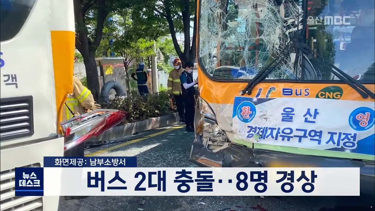 오늘(7/5) 오전 8시 50분쯤 남구 무거사거리에서 시내버스 2대가 부딪쳤습니다. 이 사고로 두 시내버스에 타고 있던 승객 8명이 다쳤지만 중상자는 없는 것으로 알려졌습니다. 구조 당국은 두 버스가 무거삼거리에서 웅촌 방향으로 달리던 중 추돌한 것으로 보고 사고 경위를 조사하고 있습니다.//