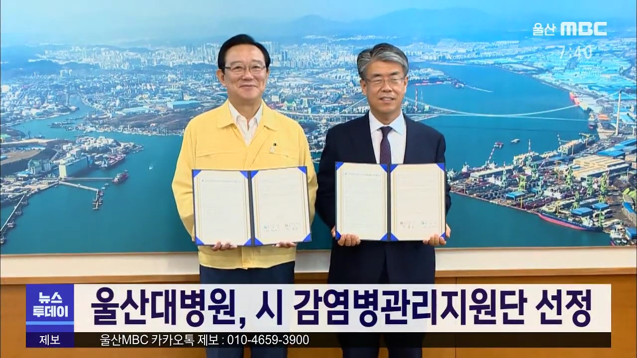 울산대학교병원이 '울산시 감염병관리지원단'에 선정됐습니다. 울산시는 공모와 심사를 거쳐 울산대학교 병원을 감염병관리지원단 위·수탁 기관으로 선정하고 협약을 맺었습니다. 감염병관리지원단은 위기 경보 1, 2단계에 따른 감염병 예방관리계획 수립과 즉각 대응팀 구성 등의 역할을 담당합니다.//