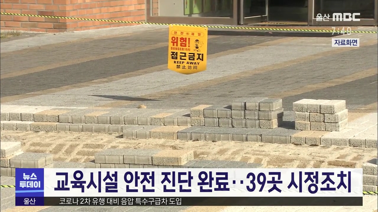 울산시교육청이 교육시설 1,075곳을 대상으로안전 진단을 실시하고 39곳을 시정조치했다고밝혔습니다.지역 교육시설 가운데 20년 이상 경과된 건축물은 274개동이며, 재해위험 취약시설은 16곳으로,시교육청은 지난달 이 시설물에 대한민간합동점검을 벌여 보완공사를 하거나 즉시처리 등으로안전 진단을 완료했다고 설명했...
