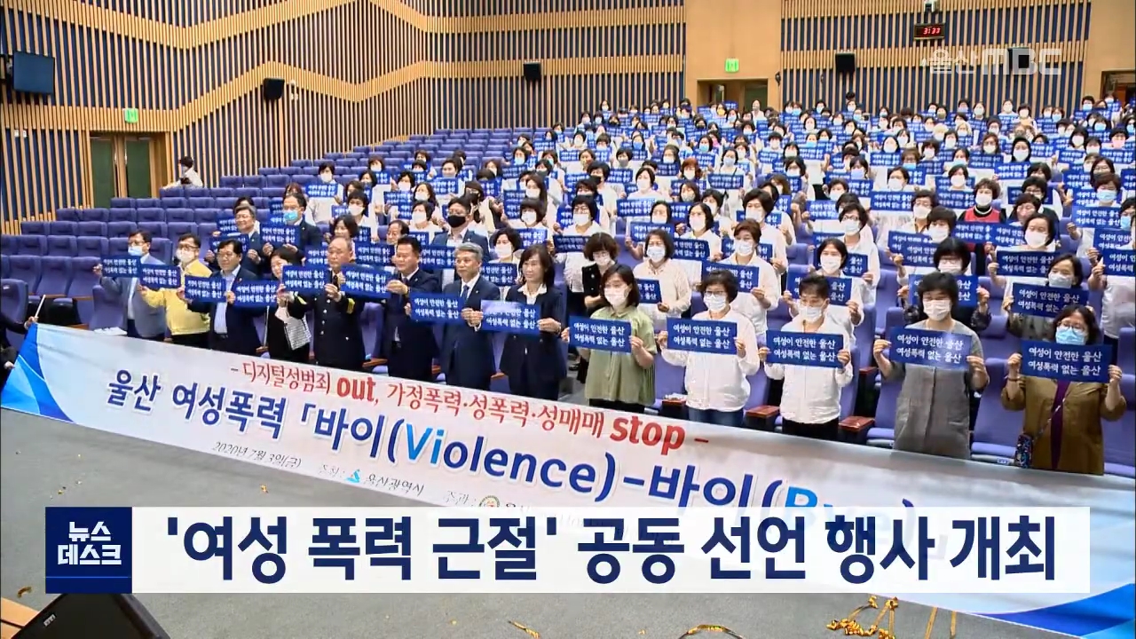 '울산 여성 폭력 근절을 위한 공동 선언'이 오늘(7/3) 시청에서 열렸습니다. 공동선언문에는 여성폭력 없는 생활 환경 조성과 정책 추진, 신속한 경찰 수사와 엄중한 처벌 등을 촉구하는내용이 담겼습니다. 이 행사는 울산시와 울산시의회, 울산지방경찰청, 울산여성단체협의회가 공동으로 개최했습니다. //