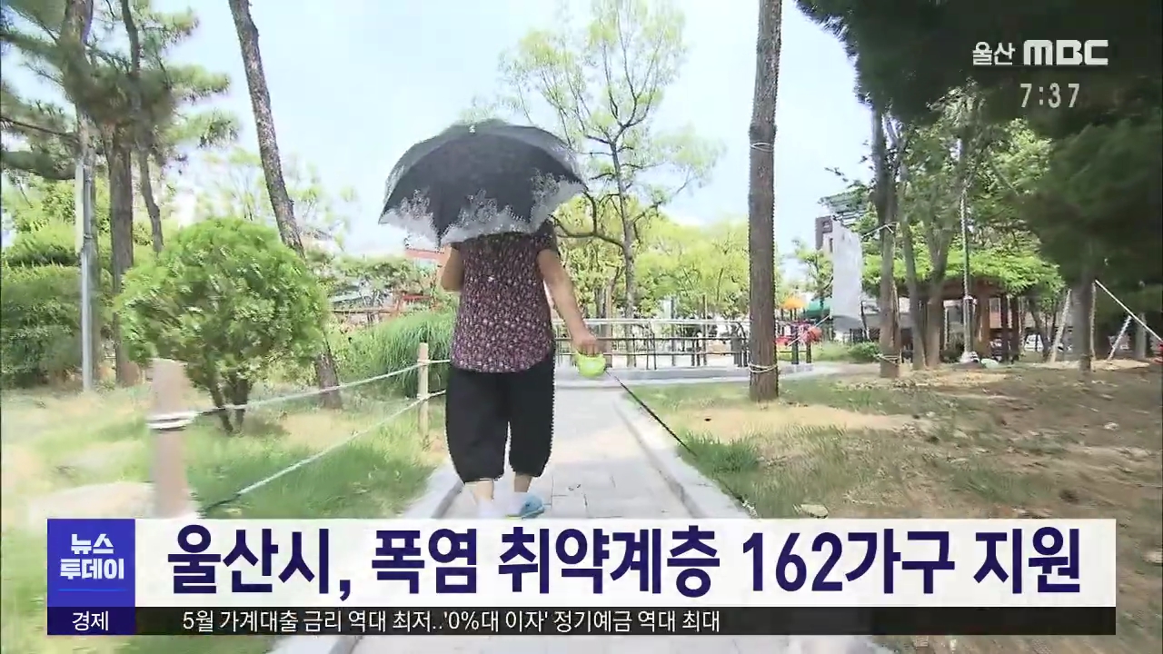 울산시가 폭염 피해를 줄이기 위해 취약 계층을 지원합니다. 시는 독거노인 등 취약계층 162가구를 대상으로 쿨매트와 선풍기, 양산 등 폭염 대응 물품을 제공합니다. 기상청은 올 여름은 작년보다 폭염일수가 길고, 특히 7월 하순부터 8월은 열대야가 많이 나타날 것으로 내다봤습니다. //