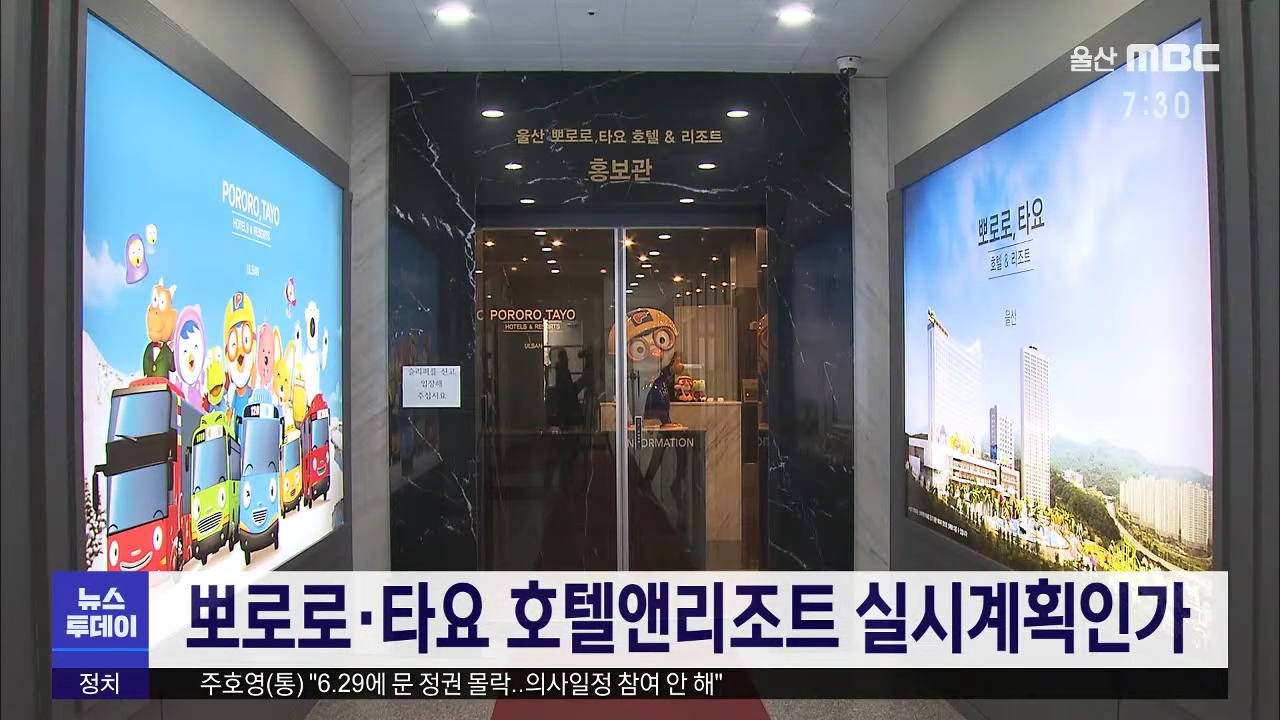 북구 강동관광단지 '뽀로로·타요 호텔앤리조트 조성사업'의 실시계획인가가 오늘(6/29) 고시됐습니다. 사업시행사는 이번 실시계획인가를 바탕으로 문화재 발굴조사와 건축허가 등 행정절차를 거친 뒤 올 하반기 착공에 들어갈 계획입니다. 시행사는 8만7천 제곱미터 부지에 4천2백억 원을 들여 2023년 리조트 시설을 완공...