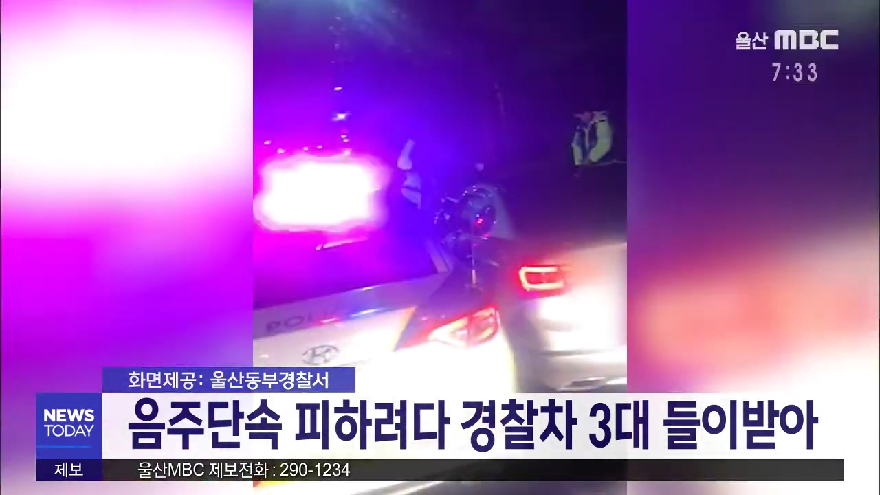 어제(6/24) 저녁 9시 40분쯤 울산시 동구 방어진순환도로에서 승용차가 음주단속을 피해 달아나다 경찰차를 들이받는 사고가 발생했습니다. 20대 운전자 A 씨는 방어동 방향으로 차를 몰고 가던 중 음주단속 현장을 발견하고 달아나다 경찰차 3대를 들이받았습니다. 경찰은 당시 A 씨의 혈중알콜농도가 면허취소 수준이었고...