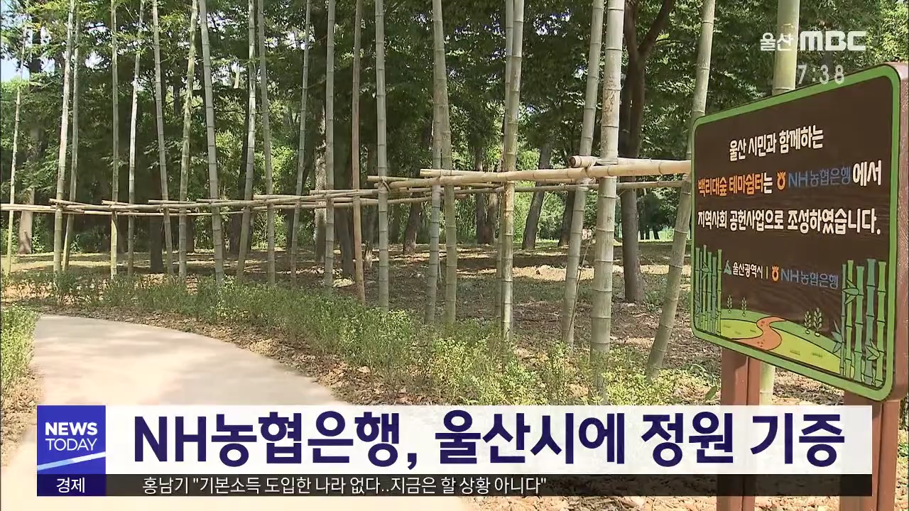 NH농협은행이 태화강 백리대숲 조성사업 구간에 정원을 만들어 울산시에 기증했습니다. 농협은행은 울주군 범서읍 선바위공원 일대 2천 500㎡ 부지에 대나무와 꽝꽝나무 등 나무 2천 300 그루를 심고, 각종 편의시설을 설치해 정원을 조성했습니다. 태화강 백리대숲 조성사업은 명촌교부터 석남사까지 40km, 100리 구간에 ...