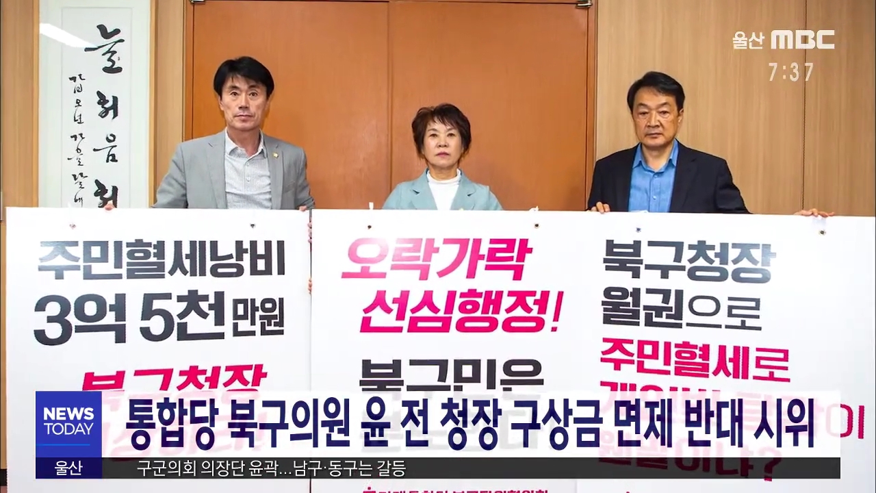 미래통합당 북구의원들이 윤종오 전 북구청장의 구상금 채권 면제는 북구 주민들의 혈세를 사용하는 것이라고 비판하며 릴레이 1인 시위를 시작했습니다. 백현조 부의장과 정치락, 이정민 의원 등 통합당 의원 3명은 오늘(6/15)부터 매일 오전 1시간씩 북구청 입구에서 1인시위를 한다고 밝혔습니다. 한편 북구의회는 오는 ...
