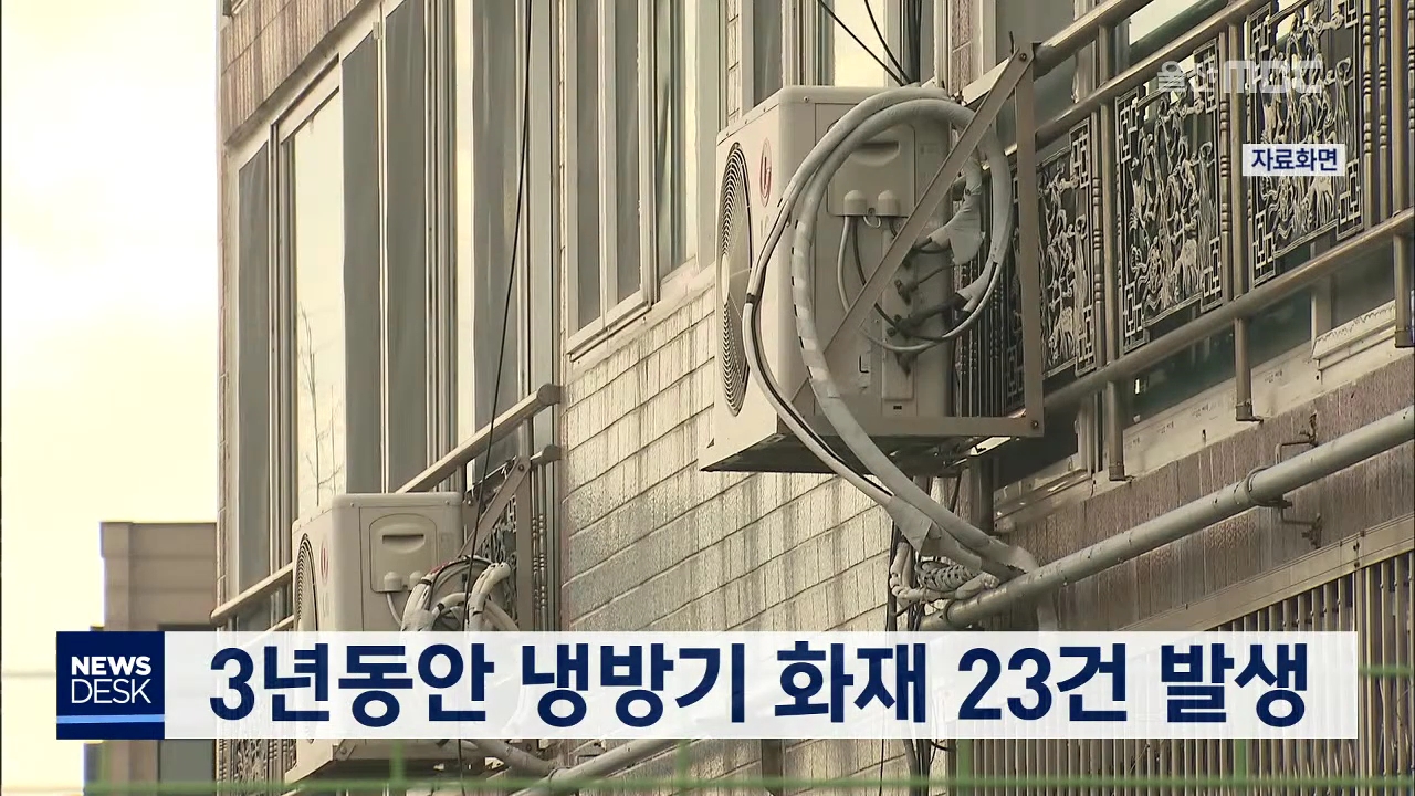 울산에서 최근 3년동안 에어컨과 선풍기 등 여름철 냉방기 화재가 23건이 발생해 주의가 필요합니다. 울산소방본부는 최근 3년동안 울산에서 발생한 냉방기 화재가 모두 23건이며 이 가운데 에어컨 실외기가 12건, 선풍기가 5건 등으로 조사됐다고 밝혔습니다. 화재 원인별은 과열과 과부하에 따른 화재가 17건으로 가장 많...