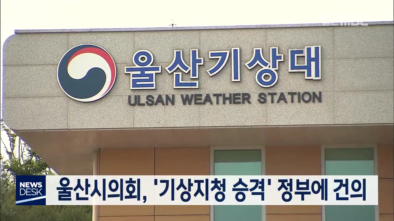 울산시의회가 울산기상대의 기상지청 승격을 촉구하는 건의안을 정부에 전달합니다. 시의회 서휘웅 의원이 대표 발의한 기상지청 승격 건의안은, 울산에는 7대 도시 중 유일하게 부산지방기상청 산하 기상대가 운영되고 있어 양질의 기후 서비스가 필요하다는 내용입니다. 시의회는 40개 민간단체와 기업체, 시민 8만여 명...
