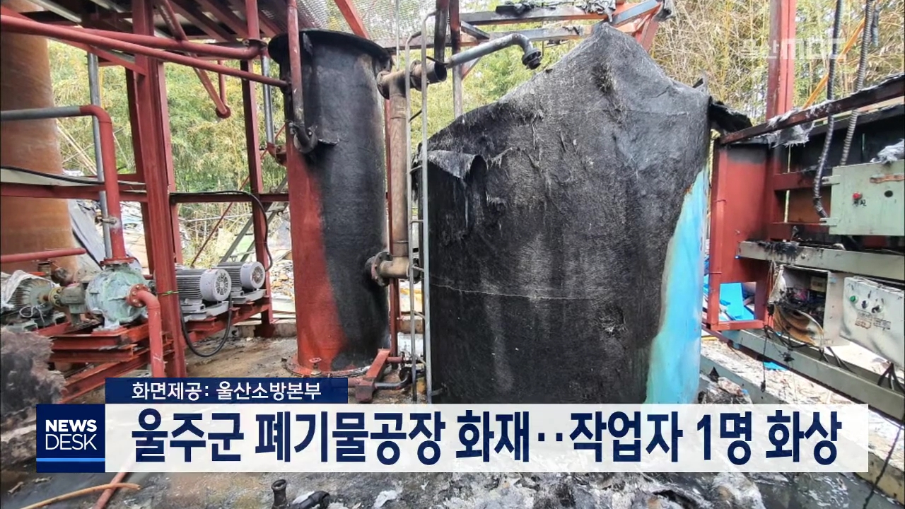 오늘(5/30) 오전 9시 25분쯤 울주군 삼남면의한 폐기물처리업체에서 불이 났습니다. 이 불로 직원 62살 조 모 씨가 화상을 입어 병원으로 옮겨졌고, 소방서 추산 천6백만 원의 재산피해가 났습니다. 소방당국은 열분해기 시운전 중에 불이 났다는 직원의 말을 토대로 화재원인을 조사하고 있습니다.