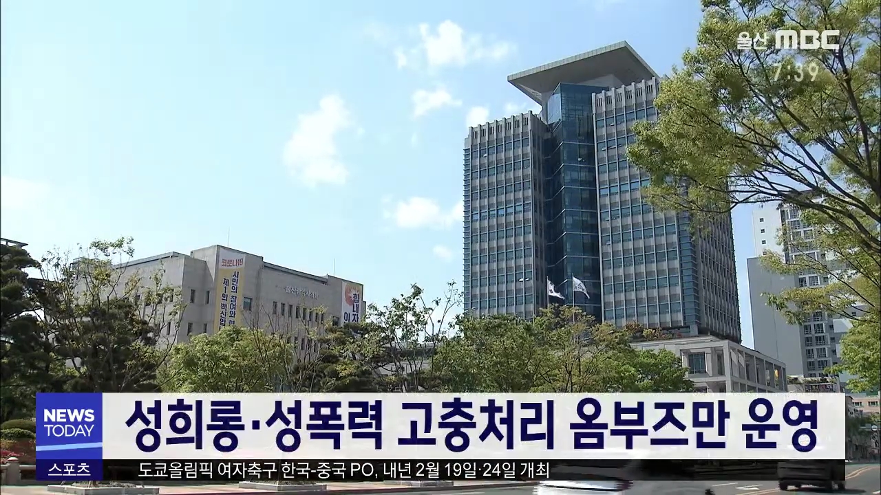 울산시가 내년부터 '성희롱·성폭력 고충처리 옴부즈만'을 운영하기로 했습니다. 시는 이에 따라 내부 공무원으로 구성된 고충상담원 외에 성폭력 상담 분야 외부 전문가를 지정하기로 했습니다. 또, 매월 셋째 주 금요일을 성희롱·성폭력 예방의 날로 지정해 성인지 감수성을 스스로 평가하는 시간을 마련하겠다고 밝혔습니...