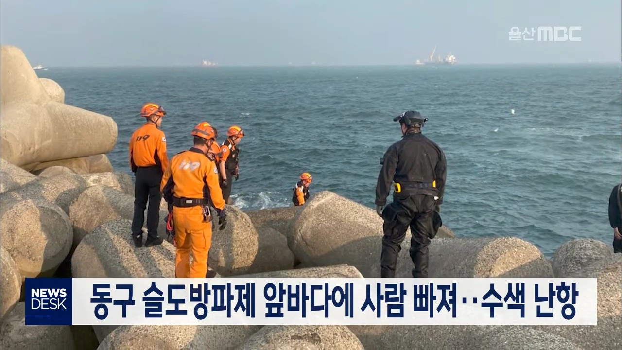 어제(5/26) 오후 5시 45분쯤 동구 슬도방파제 근처에서 사람이 바다에 빠졌다는 신고가 접수됐습니다. 해경과 소방당국은 바다에 빠진 사람을 40대 남성으로 특정하고 수색에 나섰지만 바람이 심하게 불고 파도가 거세 수색에 어려움을 겪고 있습니다. 해경과 소방당국은 계속해서 상황을 파악하며 수색을 진행할 예정이라...