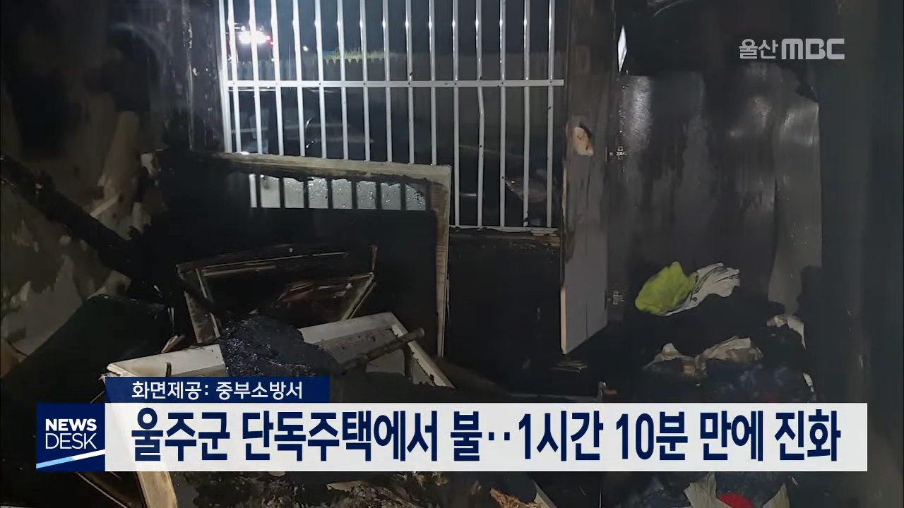 어제(5/26) 저녁 7시 48분쯤 울주군 언양읍의 한 단독주택에서 불이 나 가전제품 등을 태워 소방서 추산 830만 원의 재산피해를 내고 1시간 10분만에 꺼졌습니다. 소방당국은 충전중이던 배터리에서 불이 시작됐다는 목격자의 진술을 토대로 정확한 화재원인을 조사하고 있습니다.//