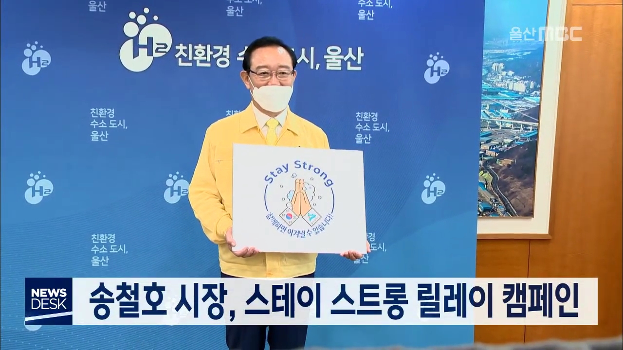 송철호 시장이 코로나19 극복을 위한 '스테이스트롱 릴레이 캠페인'에 동참했습니다. 이선호 울주군수로부터 추천을 받은 송 시장은 다음 주자로 울산현대 이청용 선수와 박남춘 인천시장, 최문순 강원도지사를 지명했습니다. 스테이스트롱 릴레이 캠페인은 연대와 지지로 코로나19 글로벌 위기를 이겨내자는 취지로 외교부...