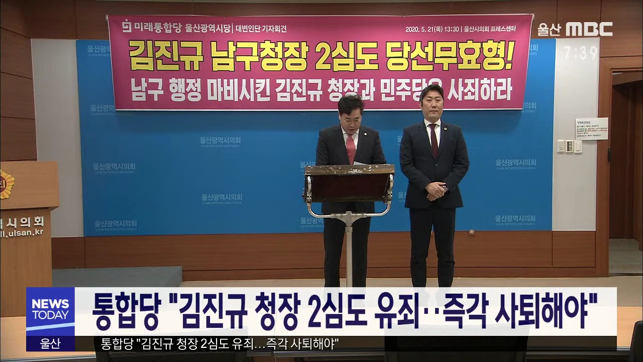 미래통합당 울산시당은 오늘(5/21) 기자회견을 열고 공직선거법 위반으로 2심에서도 당선무효형을 받은 김진규 남구청장에게 즉각 사퇴할 것을 요구했습니다. 이들은 2심 법원도 김진규 청장에게 유죄 판결을 내린 만큼, 김진규 청장은 대법원 상고를 포기하고 남구청장직에서 즉각 사퇴해야 한다고 주장했습니다. 또 김진...