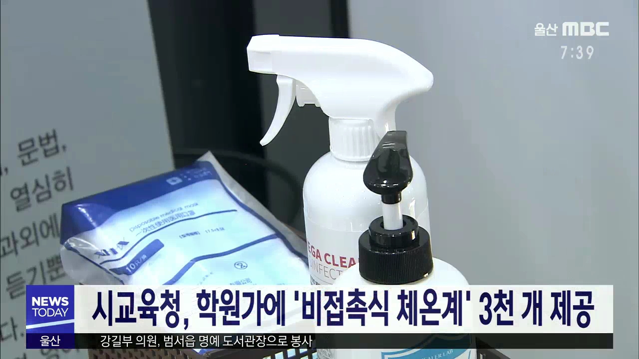 울산시교육청은 어제와 오늘(5/17) 이틀 동안 울산과학관과 강북교육지원청에서 지역 학원 관계자 3천여 명에게 비접촉식 체온계를 나눠줬습니다. 체온계는 차 안에서 받을 수 있는 드라이브 스루 방식으로 제공됐으며, 시교육청은 지난 3월 소독제에 이은 2차 방역물품 지원이라고 설명했습니다.//