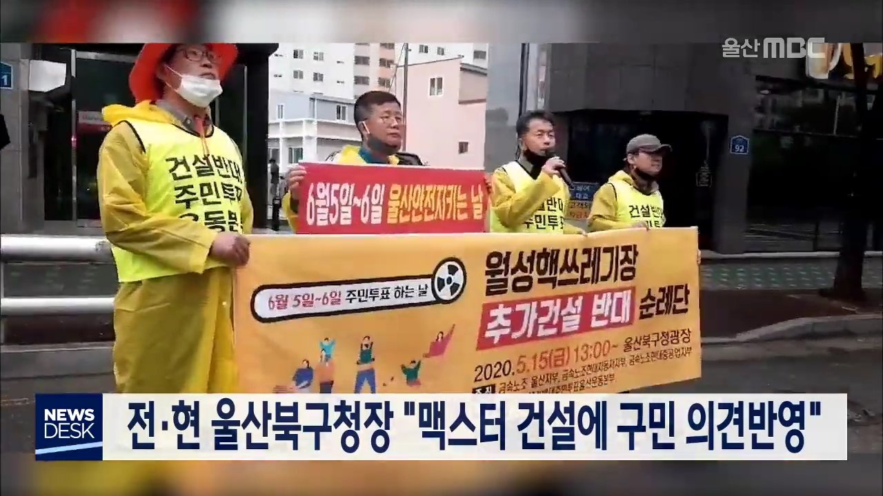 전·현직 울산 북구청장들이 오늘(5/15) 경주 월성 원전 사용후핵연료 임시저장시설 '맥스터' 건설에 구민 의견을 반영해달라고 요구하는 도보 행진 행사를 열었습니다. 이동권 현 구청장과 윤종오·이상범 전 구청장은 오늘(5/15) 오후 북구청에서 경주 월성원전까지 20㎞ 구간을 걸어가며 맥스터 증설에 북구 주민의 의견을...