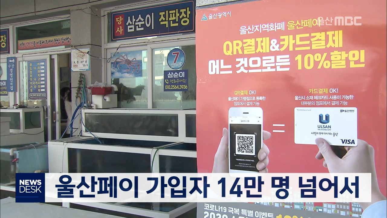 울산의 지역화폐인 ‘울산페이’ 이용자와 가맹점이 급증한 것으로 나타났습니다. 울산시의 울산페이 운영현황을 분석한 결과 4월 말까지 울산페이 신규가입자는 울산 인구의 10%가 넘는 14만명을 넘어섰습니다. 이 가운데 신종코로나 사태로 울산페이 할인율을 기존 5%에서 10%로 확대한 이후 지난 4월 한달동안 가입자가 5...