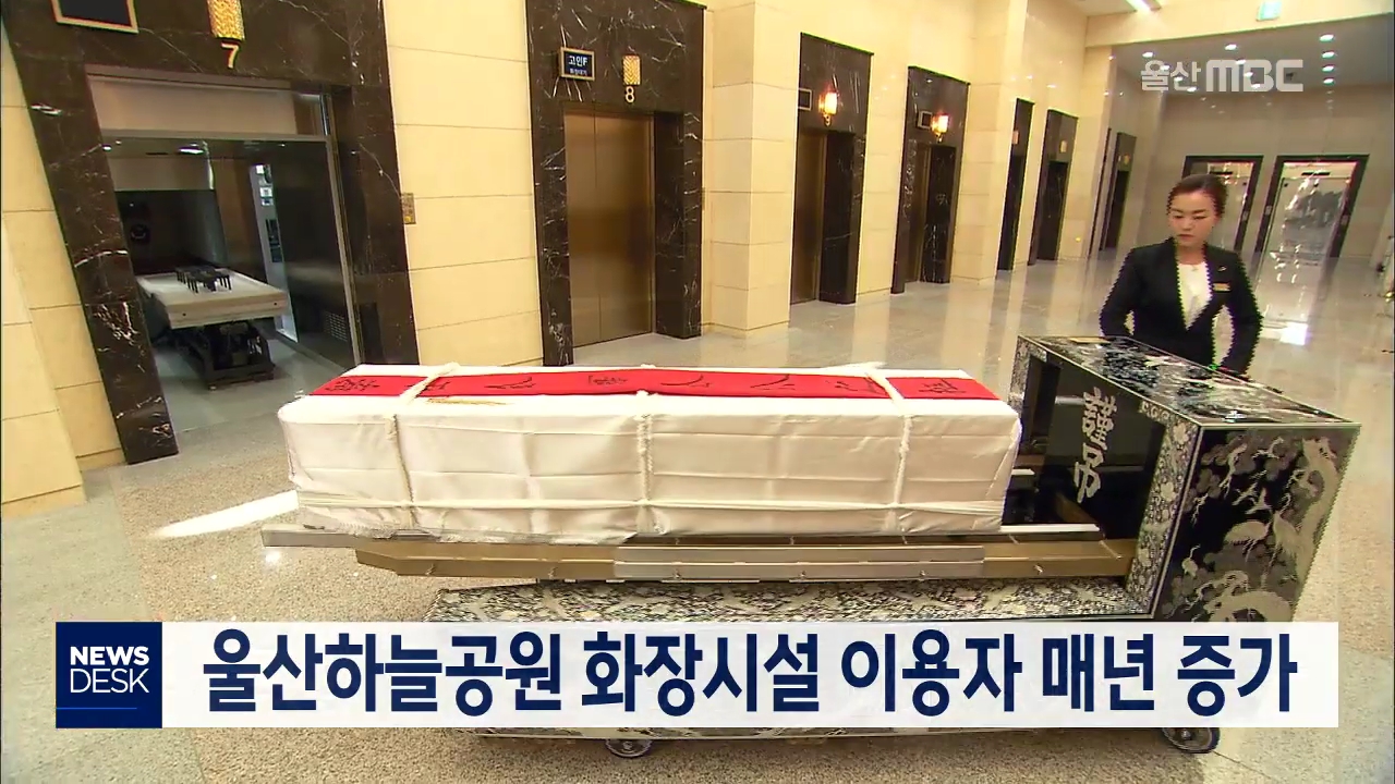 울산하늘공원 화장시설 이용자가 2013년 개관한 이후 매년 꾸준히 증가하고 있습니다. 지난 2013년 3천900여 건이었던 화장건수는 크게 증가해 2017년 6천여 건을 넘어섰고 지난해 6천900여 건으로 나타났습니다. 하늘공원 관계자는 이곳이 울산의 유일한 화장시설이고 화장시설 운영 시간이 길어 경주와 부산 등 인근 도시...