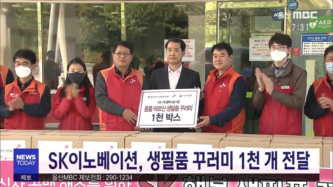 SK이노베이션 노사가 오늘(4/28) 남구 선암호수노인복지관에서 저소득 독거노인의 결식 방지를 위해 SK행복 생필품 꾸러미를 전달했습니다. SK이노베이션은 임직원 급여 1%로 조성하는 행복나누기금을 활용해, 쌀 5kg과 라면, 국, 김, 반찬 등으로 구성된 생필품 꾸러미 1천 개를 마련했다고 밝혔습니다. //