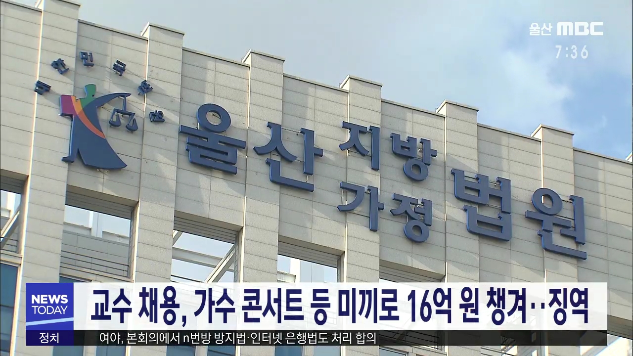 울산지법 형사4단독 김정석 부장판사는 대학교수로 채용시켜 주겠다거나, 인기 가수 콘서트 행사에 투자하라는 등의 수법으로 16억여원을 가로챈 A씨에게 징역 6년 6개월을 선고했습니다. A씨는 2016년 2월 음대 교수로 취직하려면 발전기금 명목으로 5억원을 내야 한다며 피해자에게서 3억3천만원을 받아 챙겼으며 자신을 ...