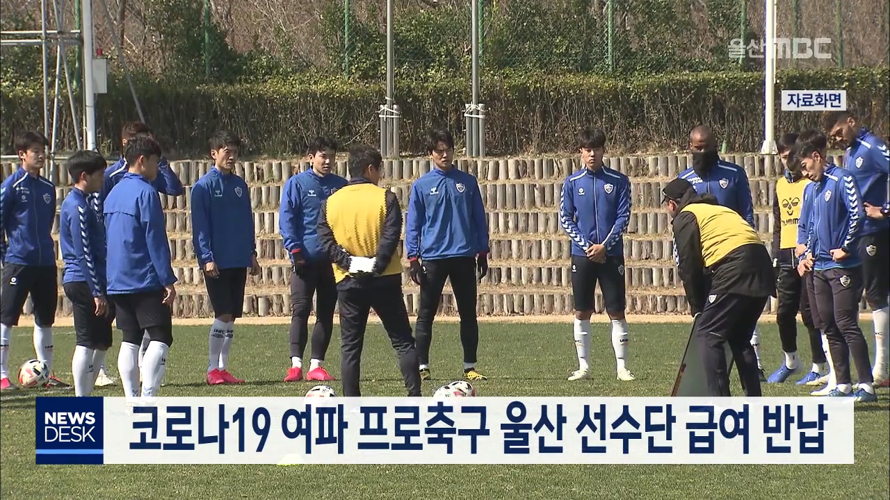 코로나19 여파로 프로축구 울산 현대 임직원들이 급여 일부를 반납하기로 했습니다. 프로축구 울산 현대는 시즌 개막 연기로 구단 수입이 줄어들고 있다며 5월 급여부터 임원은 20%, 일반 직원은 10%를 반납한다고 밝혔습니다. 한편 프로축구는 코로나19로 경기 일정이 무기한 연기되고 있습니다.